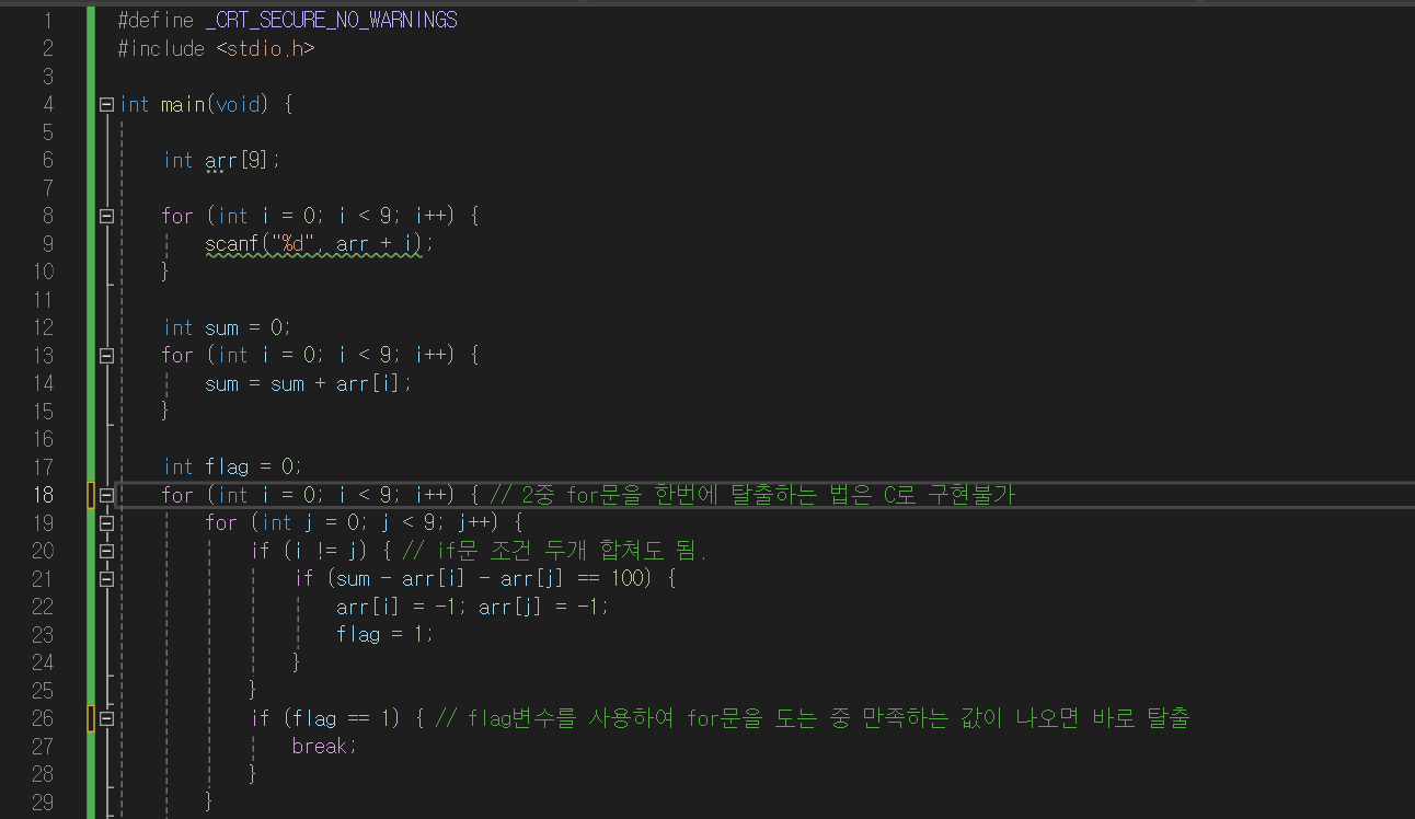 2중 for문은 C에서 한번에 탈출이 불가능하다. goto문은 안쓰는게 권장됨. flag를 통해 만족하는 경우가 나오면 바로 탈출하도록 할 수 있음.