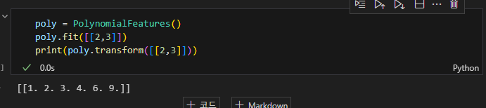 PolynomialFeatures : 사이킷런의 변환기중 하나이며 sklearn.pre