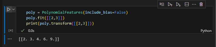 사이킷런 홈페이지에서 레퍼런스를 확인할 수 있다. degree = 2일 때 아래와 같이 [1,a,b,a^2,ab,b^2]를 반환하는 것을 볼 수 있다. (1은 선형 방정식의 절편. 절편은 항상 1과 곱해진다고 볼 수 있음, 디폴드 degree값은 2)