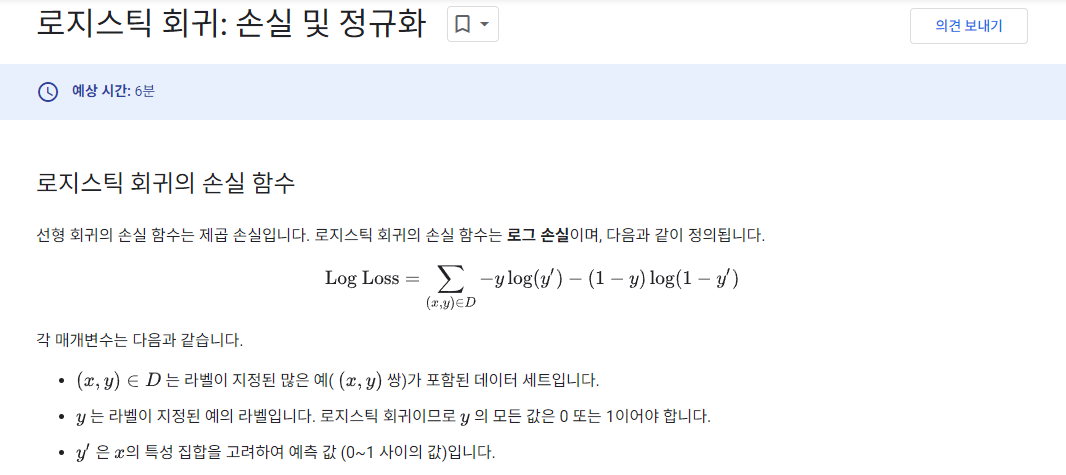 예측 확률을 범위는 로지스틱 회귀 모델의 시그모이드 함수에 따라 0~1사이 값을 가진다. 이때 각 확률에 대한 양성 클래스와 음성 클래스를 기반으로 손실함수를 계산한다.
